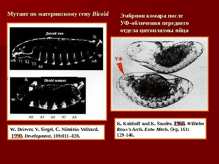K. Kalthoff and K. Sander. 1968. Wilhelm Roux’s Arch. Entw M ech. Org. 161: 129 -146. W. Driever, V. Siegel, C. Nüsslein-Volhard. 1990. . Development. 109: 811– 820. Bicoid mutant Дикий тип УФМутант по материнскому гену Bicoid Эмбрион комара после УФ-обличения переднего отдела цитоплазмы яйца