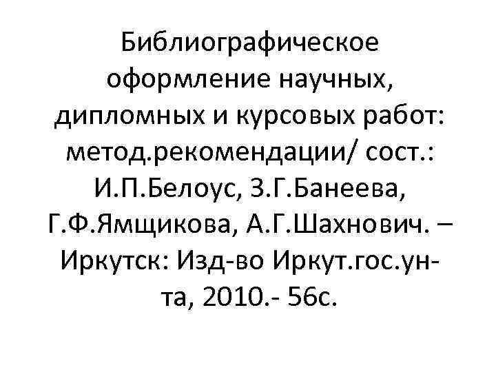 Библиографическое оформление научных, дипломных и курсовых работ: метод. рекомендации/ сост. : И. П. Белоус, З. Г. Банеева, Г. Ф. Ямщикова, А. Г. Шахнович. – Иркутск: Изд-во Иркут. гос. унта, 2010. - 56 с.
