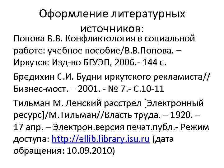 Оформление литературных источников: Попова В. В. Конфликтология в социальной работе: учебное пособие/В. В. Попова. – Иркутск: Изд-во БГУЭП, 2006. - 144 с. Бредихин С. И. Будни иркутского рекламиста// Бизнес-мост. – 2001. - № 7. - С. 10 -11 Тильман М. Ленский расстрел [Электронный ресурс]/М. Тильман//Власть труда. – 1920. – 17 апр. – Электрон. версия печат. публ. - Режим доступа: http: //ellib. library. isu. ru (дата обращения: 10. 09. 2010)