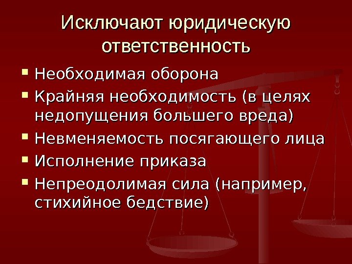 Исключают юридическую ответственность Необходимая оборона Крайняя необходимость (в целях недопущения большего вреда) Невменяемость посягающего лица Исполнение приказа Непреодолимая сила (например, стихийное бедствие)