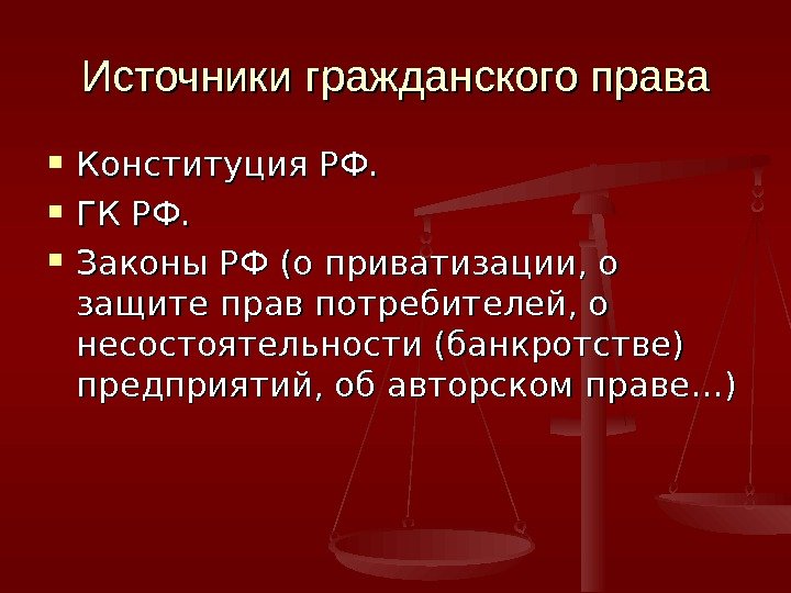 Источники гражданского права Конституция РФ. ГК РФ. Законы РФ (о приватизации, о защите прав потребителей, о несостоятельности (банкротстве) предприятий, об авторском праве…)