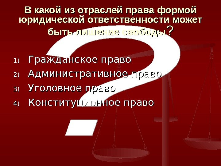 В какой из отраслей права формой юридической ответственности может быть лишение свободы ? ? 1)1) Гражданское право 2)2) Административное право 3)3) Уголовное право 4)4) Конституционное право