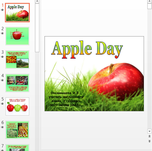 В презентации подробно рассказывается о праздновании, о том, что принято делать в этот день. Слайды наполняет разнообразие яблок: каких только сортов на самом деле нет! О многих мы даже и не знали – растут ли такие яблочки в вашем саду?