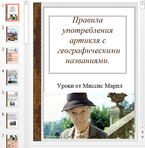 Уроки от миссис Марпл обрели широкую популярность. Пожилая леди путешествует по миру и рассказывает нам о правилах английской грамматики.