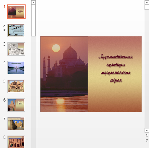 В начале презентации представлена схема, демонстрирующая место мусульманской культуры среди других. Далее демонстрируются две карты, указывающие конкретное место дислокации. После следует рассказ об архитектуре ислама.