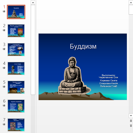 Данная презентация рассказывает об одном из направлений в религии, а именно – буддизме. Слайды подготовлены в качестве домашнего задания или проекта к школьному уроку по культуре. Они качественно, эстетично оформлены и равномерно заполнены информацией, сопровождающейся картинками.