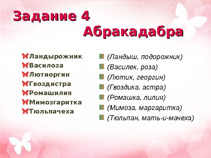 Задание 4 Абракадабра Ландырожник Василоза Лютиоргин Гвоздистра Ромашилия Мимозгаритка Тюльпачеха (Ландыш, подорожник) (Василек, роза) (Лютик, георгин) (Гвоздика, астра) (Ромашка, лилия) (Мимоза, маргаритка) (Тюльпан, мать-и-мачеха)