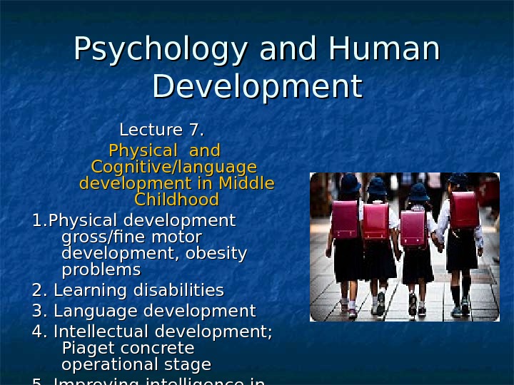 Psychology and Human Development Lecture 7. Physical and Cognitive/language development in Middle Childhood 1. Physical development gross/fine motor development, obesity problems 2. Learning disabilities 3. Language development 4. Intellectual development; Piaget concrete operational stage 5. Improving intelligence in middle children.
