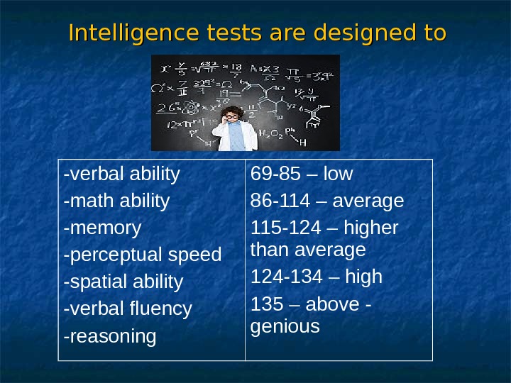 Intelligence tests are designed to measure -verbal ability -math ability -memory -perceptual speed -spatial ability -verbal fluency -reasoning 69 -85 – low 86 -114 – average 115 -124 – higher than average 124 -134 – high 135 – above — genious