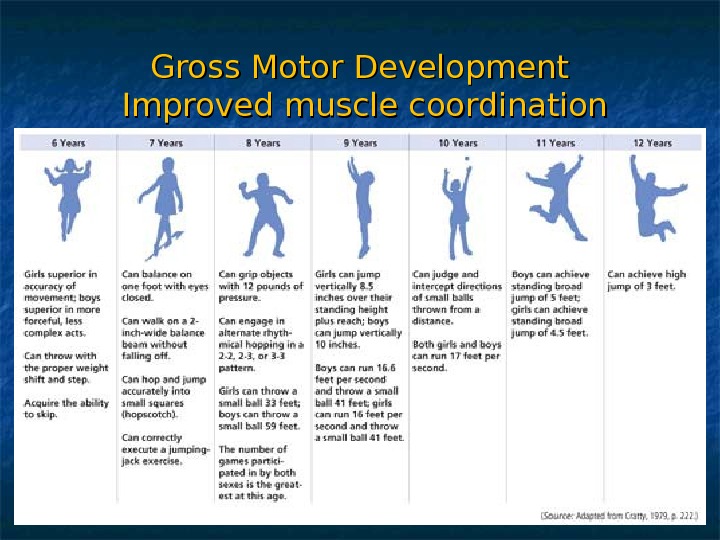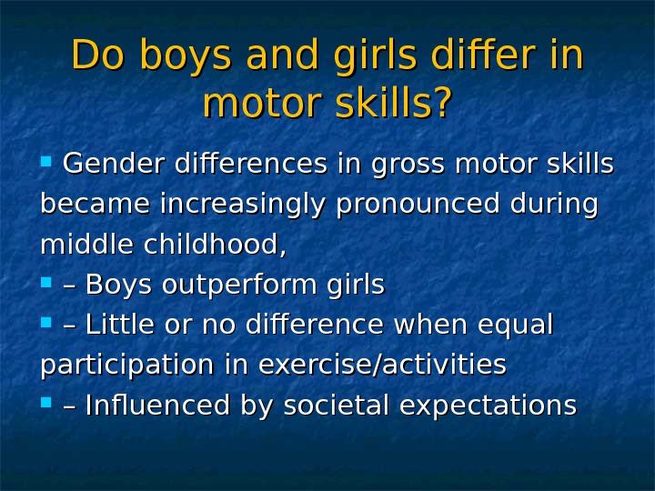 Do boys and girls differ in motor skills? Gender differences in gross motor skills became increasingly pronounced during middle childhood, – – Boys outperform girls – – Little or no difference when equal participation in exercise/activities – – Influenced by societal expectations