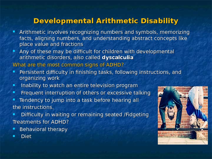 Developmental Arithmetic Disability Arithmetic involves recognizing numbers and symbols, memorizing facts, aligning numbers, and understanding abstract concepts like place value and fractions Any of these may be difficult for children with developmental arithmetic disorders, also called dyscalculia What are the most common signs of ADHD? Persistent difficulty in finishing tasks, following instructions, and organizing work Inability to watch an entire television program Frequent interruption of others or excessive talking Tendency to jump into a task before hearing all the instructions. Difficulty in waiting or remaining seated /Fidgeting Treatments for ADHD? Behavioral therapy Diet