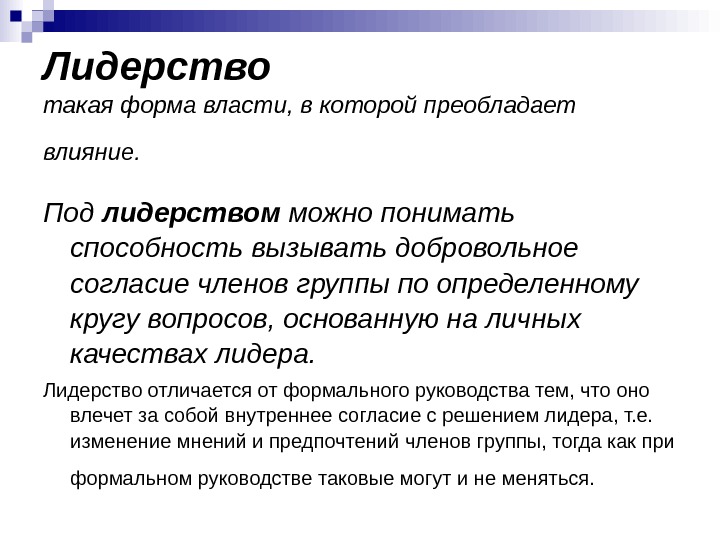 Лидерство такая форма власти, в которой преобладает влияние. Под лидерством можно понимать способность вызывать добровольное согласие членов группы по определенному кругу вопросов, основанную на личных качествах лидера. Лидерство отличается от формального руководства тем, что оно влечет за собой внутреннее согласие с решением лидера, т. е. изменение мнений и предпочтений членов группы, тогда как при формальном руководстве таковые могут и не меняться.