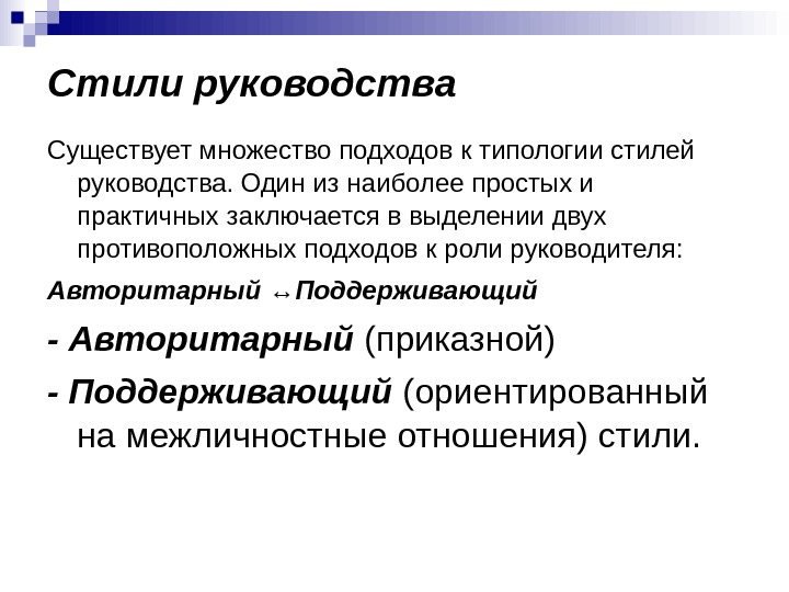 Стили руководства Существует множество подходов к типологии стилей руководства. Один из наиболее простых и практичных заключается в выделении двух противоположных подходов к роли руководителя: Авторитарный ↔ Поддерживающий — Авторитарный (приказной) — Поддерживающий (ориентированный на межличностные отношения) стили.