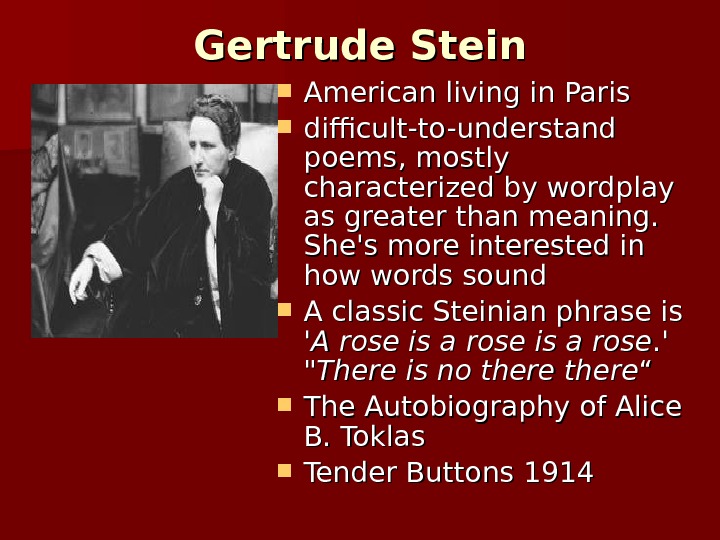 Gertrude Stein American living in Paris difficult-to-understand poems, mostly characterized by wordplay as greater than meaning. She’s more interested in how words sound A classic Steinian phrase is ‘A rose is a rose. ‘. ‘ «» There is no there ““ The Autobiography of Alice B. Toklas Tender Buttons