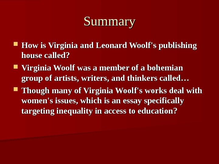 Summary How is Virginia and Leonard Woolf’s publishing house called? Virginia Woolf was a member of a bohemian group of artists, writers, and thinkers called… Though many of Virginia Woolf’s works deal with women’s issues, which is an essay specifically targeting inequality in access to education?