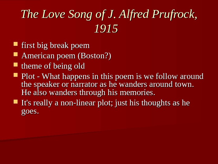 The Love Song of J. Alfred Prufrock, 1915 first big break poem American poem (Boston? ) theme of being old Plot — What happens in this poem is we follow around the speaker or narrator as he wanders around town. He also wanders through his memories. It’s really a non-linear plot; just his thoughts as he goes.