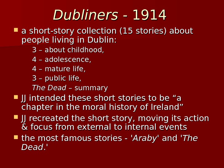Dubliners — 1914 a short-story collection (15 stories) about people living in Dublin: 3 – about childhood, 4 – adolescence, 4 – mature life, 3 – public life, The Dead – summary JJ intended these short stories to be “a chapter in the moral history of Ireland” JJ recreated the short story, moving its action & focus from external to internal events the most famous stories — ‘Araby ‘ and ‘The Dead. ‘. ‘