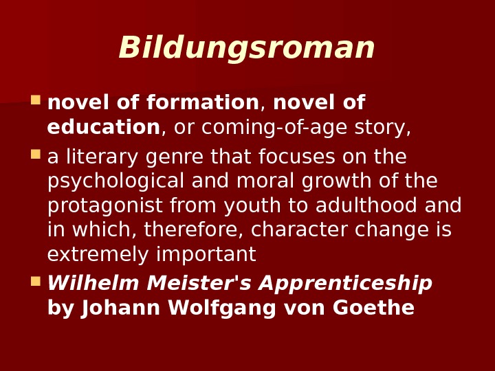Bildungsroman novel of formation , novel of education , or coming-of-age story, a literary genre that focuses on the psychological and moral growth of the protagonistfrom youth to adulthoodand in which, therefore, character change is extremely important Wilhelm Meister’s Apprenticeship by Johann Wolfgang von Goethe