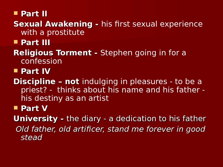 Part II Sexual Awakening — his first sexual experience with a prostitute Part III Religious Torment — Stephen going in for a confession Part IV Discipline – not indulging in pleasures — to be a priest? — thinks about his name and his father — his destiny as an artist Part V University — the diary — a dedication to his father Old father, old artificer, stand me forever in good stead