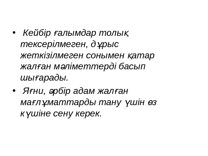 • Кейбір алымдар толы ғ қ тексерілмеген, д рыс ұ жеткізілмеген сонымен атар қ жал ан м ліметтерді басып ғ ә шы арады. ғ • Я ни, рбір адам жал ан ғ ә ғ ма л маттарды тану шін з ғ ұ ү ө к шіне сену керек. ү