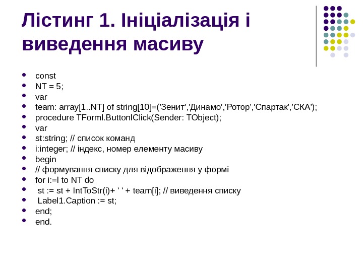 Лістинг 1. Ініціалізація і виведення масиву const NT = 5; var team: array[1. . NT] of string[10]=(‘Зенит’, ‘Динамо’, ‘Ротор’, ‘Спартак’, ‘СКА’); procedure TForml. Buttonl. Click(Sender: TObject); var st: string; // список команд i: integer; // індекс, номер елементу масиву begin // формування списку для відображення у формі for i: =l to NT do st : = st + Int. To. Str(i)+ ‘ ‘ + team[i]; // виведення списку Label 1. Caption : = st; end.