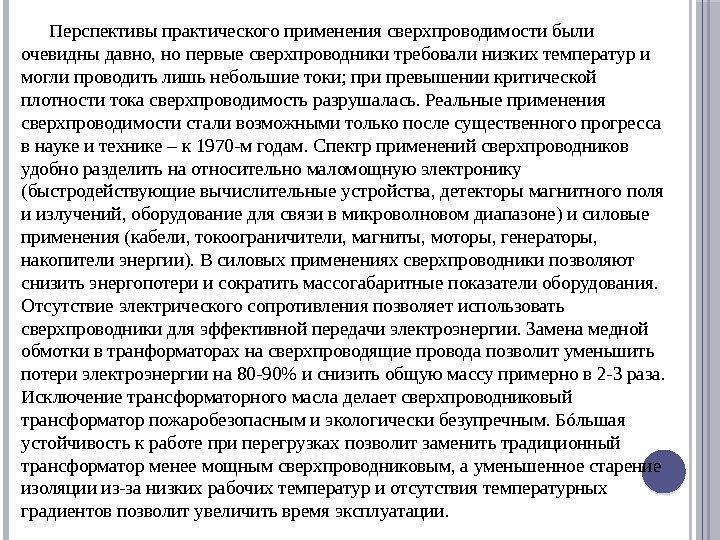 Перспективы практического применения сверхпроводимости были очевидны давно, но первые сверхпроводники требовали низких температур и могли проводить лишь небольшие токи; при превышении критической плотности тока сверхпроводимость разрушалась. Реальные применения сверхпроводимости стали возможными только после существенного прогресса в науке и технике – к 1970 -м годам. Спектр применений сверхпроводников удобно разделить на относительно маломощную электронику (быстродействующие вычислительные устройства, детекторы магнитного поля и излучений, оборудование для связи в микроволновом диапазоне) и силовые применения (кабели, токоограничители, магниты, моторы, генераторы, накопители энергии). В силовых применениях сверхпроводники позволяют снизить энергопотери и сократить массогабаритные показатели оборудования. Отсутствие электрического сопротивления позволяет использовать сверхпроводники для эффективной передачи электроэнергии. Замена медной обмотки в транформаторах на сверхпроводящие провода позволит уменьшить потери электроэнергии на 80 -90% и снизить общую массу примерно в 2 -3 раза. Исключение трансформаторного масла делает сверхпроводниковый трансформатор пожаробезопасным и экологически безупречным. Бóльшая устойчивость к работе при перегрузках позволит заменить традиционный трансформатор менее мощным сверхпроводниковым, а уменьшенное старение изоляции из-за низких рабочих температур и отсутствия температурных градиентов позволит увеличить время эксплуатации.