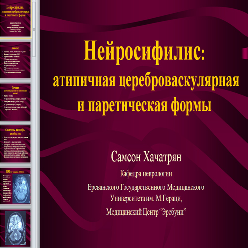 Нейросифилис: атипичная цереброваскулярная и паретическая формы. В презентации представлен пример первичного анамнеза заболевания, предложено соответствующее лечение, затем последующая симптоматика за год, дополненная снимками MRI и КТ и г/м, а также лабораторные анализы. Затем были проведены ряд мероприятий способствующих улучшению состояния пациента. В заключении студентам предлагается ответь на ряд вопросов, касающихся ведения подобных больных, а также мерам оказания лечения в данной ситуации.