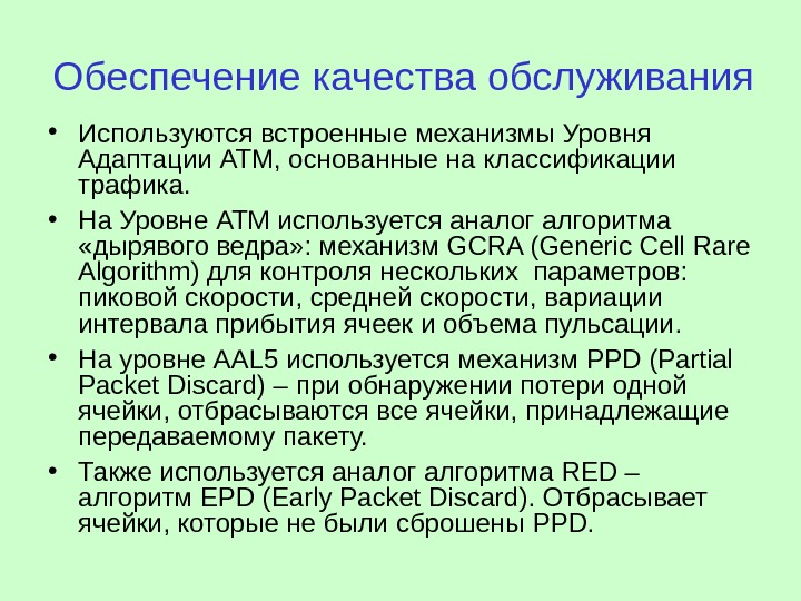 Обеспечение качества обслуживания • Используются встроенные механизмы Уровня Адаптации АТМ, основанные на классификации трафика. • На Уровне АТМ используется аналог алгоритма «дырявого ведра» : механизм GCRA (Generic Cell Rare Algorithm) для контроля нескольких параметров: пиковой скорости, средней скорости, вариации интервала прибытия ячеек и объема пульсации. • На уровне AAL 5 используется механизм PPD (Partial Packet Discard) – при обнаружении потери одной ячейки, отбрасываются все ячейки, принадлежащие передаваемому пакету. • Также используется аналог алгоритма RED – алгоритм EPD ( Early Packet Discard). Отбрасывает ячейки, которые не были сброшены PPD.