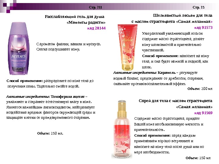 Стр. 211 Стр. 23 Шелковистый лосьон для тела с маслом страстоцвета «Самая желанная » код 91573 Ультралегкий увлажняющий лосьон содержит масло страстоцвета, делает кожу шелковистой и притягательно чувственной. Способ применения: наносите на кожу тела, и она будет нежной и гладкой, как шелк. Активные ингредиенты: Карамель – регулирует водный баланс, предохраняет от дряблости, старения, оказывает противовоспалительный эффект. Объем: 200 мл Спрей для тела с маслом страстоцвета «Самая желанная» код 91569 Содержит масло страстоцвета, придает Вашей коже необыкновенную мягкость и притягательность. Способ применения: перед каждым применением хорошо встряхните и наносите на кожу тела после душа или по мере необходимости. Объем: 150 мл. Расслабляющий гель для душа «Моменты радости» код 20144 С ароматом фиалки, ванили и мускуса. Слегка подсушивает кожу. Способ применения : распределите по коже тела до получения пены. Тщательно смойте водой. Активные ингредиенты : Токоферола ацетат – увлажняет и сохраняет естественную влагу в коже. Является важнейшим антиоксидантом, нейтрализует воздействие вредных факторов окружающей среды и защищает клетки от преждевременного старения. Объем: 250 мл.