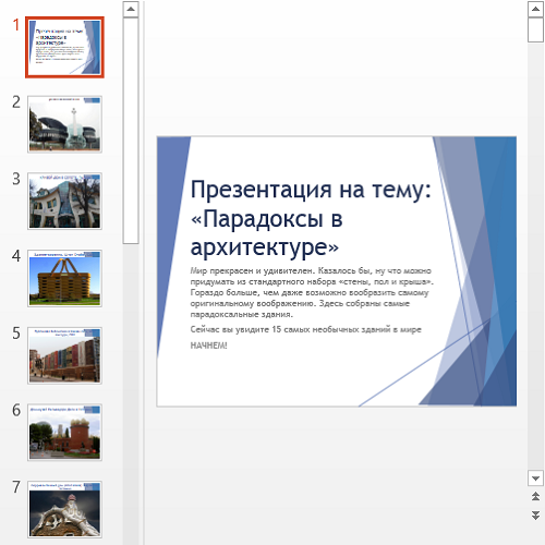Данная презентация увлечет аудиторию: несмотря на то, что слайды оформлены стандартно, информация на них очень интересная – вниманию демонстрируются здания, которые совершенно не соответствуют стандартным представлениям о строениях.