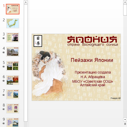 Представленная презентация погружает зрителя в мир волшебных пейзажей Японии. В начале слайдовой демонстрации предоставляется карта страны, далее говорится о ее самобытности. Внимание уделяется интересным деталям.