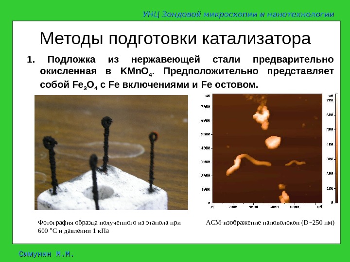 Симунин М. М. Методы подготовки катализатора 1 мм 1. Подложка из нержавеющей стали предварительно окисленная в KMn. O 4. Предположительно представляет собой Fe 3 О 4 c Fe включениями и Fe остовом. АСМ-изображение нановолокон (D~250 нм)Фотография образца полученного из этанола при 600 ° С и давлении 1 к. Па УНЦ Зондовой микроскопии и нанотехнологии