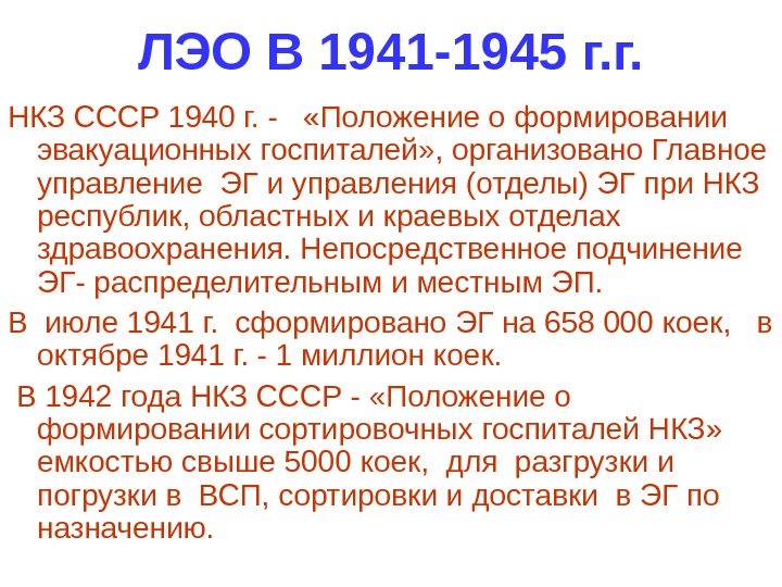 ЛЭО В 1941 -1945 г. г. НКЗ СССР 1940 г. — «Положение о формировании эвакуационных госпиталей» , организовано Главное управление ЭГ и управления (отделы) ЭГ при НКЗ республик, областных и краевых отделах здравоохранения. Непосредственное подчинение ЭГ- распределительным и местным ЭП. В июле 1941 г. сформировано ЭГ на 658 000 коек, в октябре 1941 г. — 1 миллион коек. В 1942 года НКЗ СССР — «Положение о формировании сортировочных госпиталей НКЗ» емкостью свыше 5000 коек, для разгрузки и погрузки в ВСП, сортировки и доставки в ЭГ по назначению.
