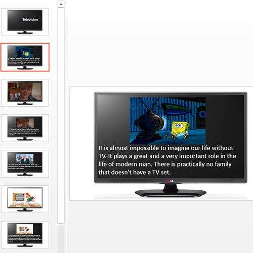 Все анимации сопровождаются грамотным английским текстом на тему телевидения и телепередач. Презентация заинтересует, удивит каждого: и ученика, и студента, и учителя, и преподавателя.