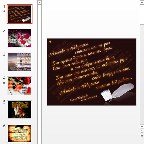 У данной презентации интересная задумка – автор пытается раскрыть тему любви в известных музыкальных произведениях. Первый слайд работы эстетично оформлен, текст на нем читабелен, также и на втором. Далее информацию уже сложно прочесть, так как он размещен поверх яркого изображения. Несомненно, текст презентации стоит внимания, но над дизайном шаблона стоит поработать. В целом, этой слайдовой демонстрации можно дать характеристику основы для дальнейшей доработки. Вдохновенный настрой автора следует оформить в читабельном виде.