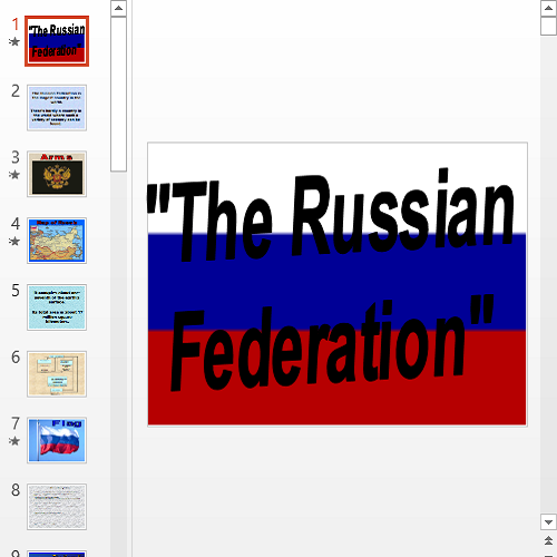 В данной презентации на английском языке рассказывается о Российской Федерации. Вниманию предоставляются сведения о территориальном месторасположении, административном устройстве, демонстрируются флаг, герб, другие символы, представляющие страну.