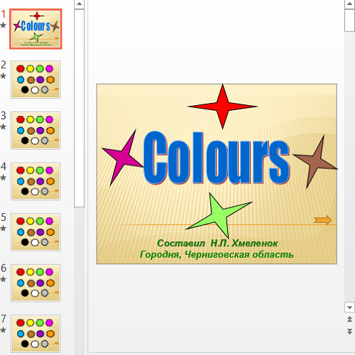На слайдах разработки располагаются фигуры, закрашенные основными цветами. Когда пользователь открывает слайд, женский голос произносит название на английском языке. Вам следует нажать на звезду, которая соответствует названному цвету. В случае правильного выбора, последует приветствие. Если же верно ответить не удастся, фигура заполнится черным цветом и будет предоставлена возможность второй попытки.