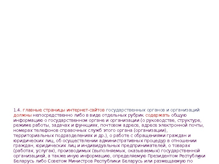 31. 4. главные страницы интернет-сайтов государственных органов и организаций должны непосредственно либо в виде отдельных рубрик содержать общую информацию о государственном органе и организации (о руководстве, структуре, режиме работы, задачах и функциях, почтовом адресе, адресе электронной почты, номерах телефонов справочных служб этого органа (организации), территориальных подразделениях и др. ), о работе с обращениями граждан и юридических лиц, об осуществлении административных процедур в отношении граждан, юридических лиц и индивидуальных предпринимателей, о товарах (работах, услугах), производимых (выполняемых, оказываемых) государственной организацией, а также иную информацию, определяемую Президентом Республики Беларусь либо Советом Министров Республики Беларусь или размещаемую по решению руководителя государственного органа и организации; 1. 6. доступ к информации, размещенной на интернет-сайтах государственных органов и организаций является свободным. Государственные органы и организации не вправе взимать плату за доступ к данной информации; 1. 7. государственные органы и организации обязаны регулярно проводить анализ посещаемости их интернет-сайтов и принимать меры по реализации предложений граждан, направленных на совершенствование функционирования этих сайтов. Порядок использования систем интернет-статистики для анализа посещаемости интернет-сайтов определяется Оперативно-аналитическим центром при Президенте Республики Беларусь.