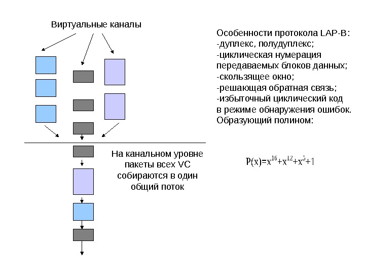 Виртуальные каналы На канальном уровне пакеты всех VC собираются в один общий поток Особенности протокола LAP-B : -дуплекс, полудуплекс; -циклическая нумерация передаваемых блоков данных; -скользящее окно; -решающая обратная связь; -избыточный циклический код в режиме обнаружения ошибок. Образующий полином: