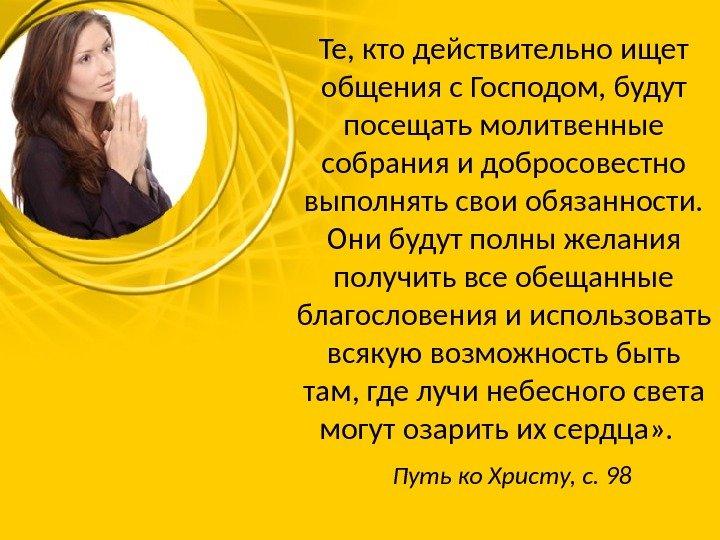 Те, кто действительно ищет общения с Господом, будут посещать молитвенные собрания и добросовестно выполнять свои обязанности. Они будут полны желания получить все обещанные благословения и использовать всякую возможность быть там, где лучи небесного света могут озарить их сердца» . Путь ко Христу, с.