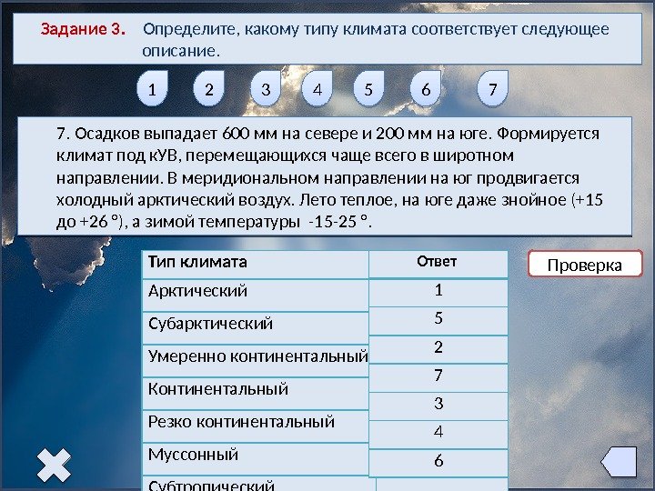 Задание 3. Определите, какому типу климата соответствует следующее описание. Тип климата Ответ Арктический Субарктический Умеренно континентальный Континентальный Резко континентальный Муссонный Субтропический 1 2 3 4 5 6 7 1. Долгая холодная зима со средними температурами -25 -30° сменяется холодным коротким летом, когда температура не превышает+5°. Осадков выпадает мало, не более 300 мм, в основном в виде снега, большую часть года покрывающего землю. 2. Западный перенос приносит круглый год влажный воздух, а количество выпадающих осадков уменьшается к юго-востоку. Зима не очень холодная, от -4° на западе до -16° на северо-востоке. Лето умеренно теплое от +12° на севере до +22° на юге. 3. Господствующий круглый год континентальный воздух формирует климат с очень холодной зимой (-25 -45°), солнечной, морозной и малоснежной. Лето солнечное и теплое (+13+20°), осадков выпадает немного , менее 500 мм. 4. Резко различающиеся по своим свойствам воздушные массы формируют сильно отличающуюся по сезонам погоду. Зима- холодная (-15 -25°), солнечная и малоснежная; лето – облачное, с большим количеством осадков и прохладное (+10+20°). Осадки в основном выпадают летом под влиянием морского воздуха и циклонов. 5. Зимой с северо-восточными ветрами сюда приходят арктические воздушные массы, а летом западные ветры приносят умеренные воздушные массы. Зима холодная, особенно в восточной части, где наблюдаются самые низкие температуры во всем северном полушарии. Количество осадков уменьшается с запада на восток. 6. Формируется под воздействием морского тропического воздуха, приходящего с Черного моря. Отличается теплой зимой (+1° +6°), теплым летом (+22° +24°) и большим количеством осадков (до 1000 мм). 7. Осадков выпадает 600 мм на севере и 200 мм на юге. Формируется климат под к. УВ, перемещающихся чаще всего в широтном направлении. В меридиональном направлении на юг продвигается холодный арктический воздух. Лето теплое, на юге даже знойное (+15 до +26 °), а зимой температуры -15 -25 °. Ответ 1 5 2 7 3 4 6 Проверка