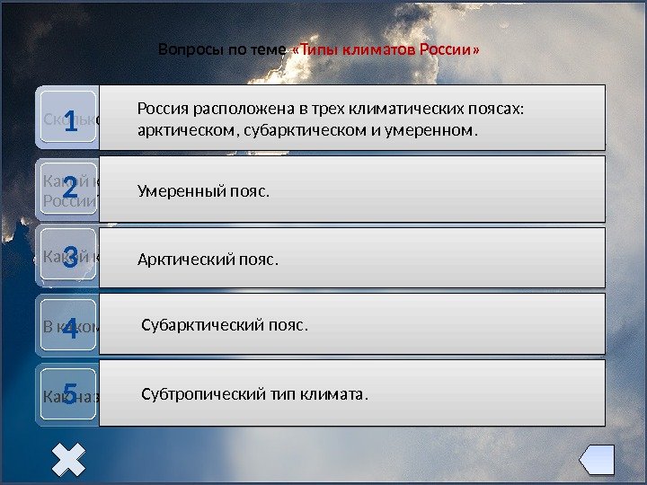 Сколько климатических поясов расположено на территории России? Какой климатический пояс занимает большую часть территории России? Какой климатический пояс самый холодный? В каком климатическом поясе господствуют два типа воздушных масс? Как называется тип климата, где самая теплая зима? 1 2 3 4 5 Россия расположена в трех климатических поясах: арктическом, субарктическом и умеренном. Умеренный пояс. Арктический пояс. Субарктический пояс. Субтропический тип климата. Вопросы по теме «Типы климатов России»