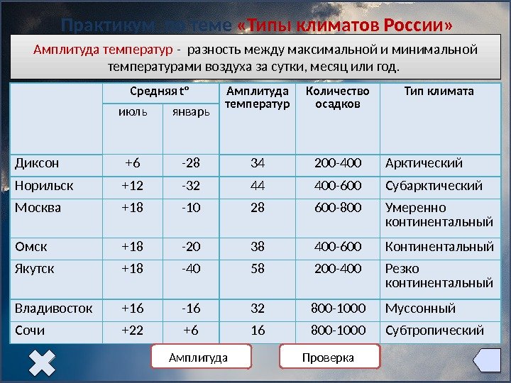 Практикум по теме «Типы климатов России» Практическая работа № 3 «Характеристика климатических поясов и областей России» Средняя t° Амплитуда Количество осадков Тип климата июль январь Диксон Норильск Москва Омск Якутск Владивосток Сочи Средняя t° Амплитуда температур Количество осадков Тип климата июль январь Диксон +6 -28 34 200 -400 Арктический Норильск +12 -32 44 400 -600 Субарктический Москва +18 -10 28 600 -800 Умеренно континентальный Омск +18 -20 38 400 -600 Континентальный Якутск +18 -40 58 200 -400 Резко континентальный Владивосток +16 -16 32 800 -1000 Муссонный Сочи +22 +6 16 800 -1000 Субтропический Проверка Амплитуда температур — разность между максимальной и минимальной температурами воздуха за сутки, месяц или год.