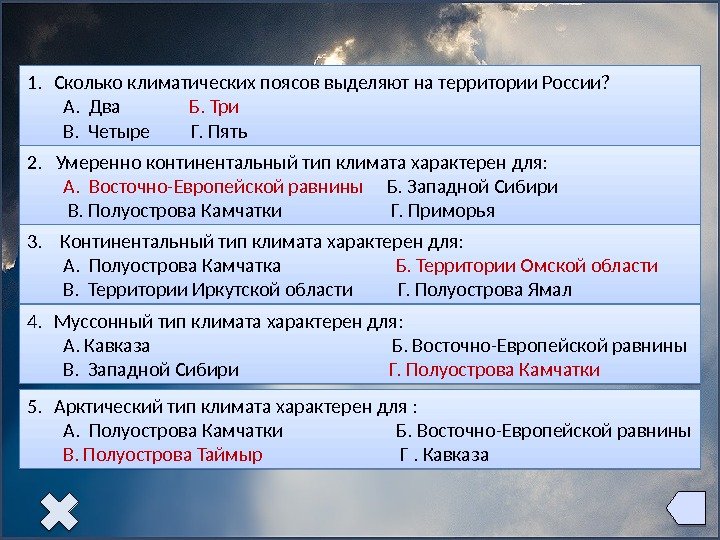 1. Сколько климатических поясов выделяют на территории России? А. Два Б. Три В. Четыре Г. Пять 2. Умеренно континентальный тип климата характерен для: А. Восточно-Европейской равнины Б. Западной Сибири В. Полуострова Камчатки Г. Приморья 3. Континентальный тип климата характерен для: А. Полуострова Камчатка Б. Территории Омской области В. Территории Иркутской области Г. Полуострова Ямал 4. Муссонный тип климата характерен для: А. Кавказа Б. Восточно-Европейской равнины В. Западной Сибири Г. Полуострова Камчатки 5. Арктический тип климата характерен для : А. Полуострова Камчатки Б. Восточно-Европейской равнины В. Полуострова Таймыр Г. Кавказа