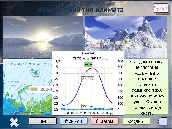 Арктический тип климата ВМ t° зимой t° летом Осадки м. АВ Арктический воздух формируется над Северным Ледовитым океаном. Поэтому даже морской воздух остается холодным. к. АВ -16° -24° -32° Зимой полярная ночь. Происходит сильное выхолаживание поверхности. Температура понижается с запада на восток (Баренцево море не замерзает). Солнечны лучи падают под наклоном, поэтому величина солнечной радиации мала. А снег и лед отражают большую её часть. Холодный воздух не способен удерживать большое количество водяного пара, поэтому остается сухим. Осадки только в виде снега. 0° +8°