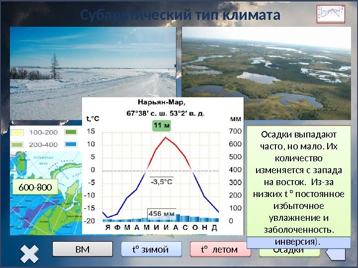 Субарктический тип климата ВМ t° зимой t° летом Осадки Субарктический пояс расположен к югу от арктического пояса. Южная граница примерно совпадает с Северным полярным кругом. В Сибири граница смещена значительно к югу. к. АВ В субарктическом поясе наблюдается сезонная смена воздушных масс. Летом господствуют воздушные массы умеренных, а зимой – арктических широт. Зима долгая, суровость нарастает к востоку: температура изменяется от -7 -12° на западе до -48° в котловинах северо-восточной Сибири (температурная инверсия). Лето достаточно прохладное. Средняя температура июля возрастает от +4+6° на севере пояса до +12+14° на юге. Особенность пояса: заморозки в любой из теплых месяцев года. -16° -24° -32° -36° -40°+8°+4° +12° Осадки выпадают часто, но мало. Их количество изменяется с запада на восток. Из-за низких t ° постоянное избыточное увлажнение и заболоченность. 600 -800 400 -600 200 —