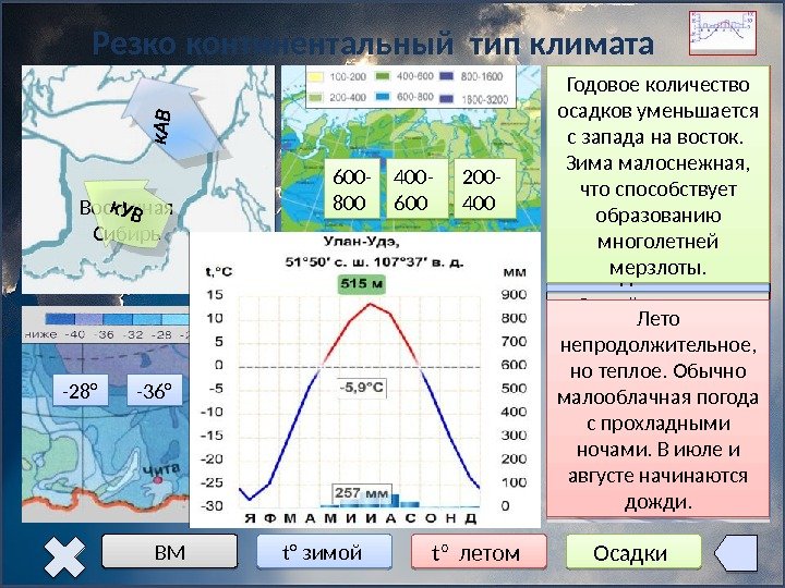 Резко континентальный тип климата ВМ t° зимой t° летом Осадки Восточная Сибирь -28° -36° -40° +12° +20° +24° 600 — 800 400 — 600 Этот климат отличается постоянным господством к. УВ. Зимой возникает устойчивый антициклон. Он препятствует проникновению других ВМ. Устойчивая малооблачная, холодная и безветренная погода. Зима длится более полугода. Здесь находится полюс холода Оймякон. Лето непродолжительное, но теплое. Обычно малооблачная погода с прохладными ночами. В июле и августе начинаются дожди. Годовое количество осадков уменьшается с запада на восток. Зима малоснежная, что способствует образованию многолетней мерзлоты. 200 —