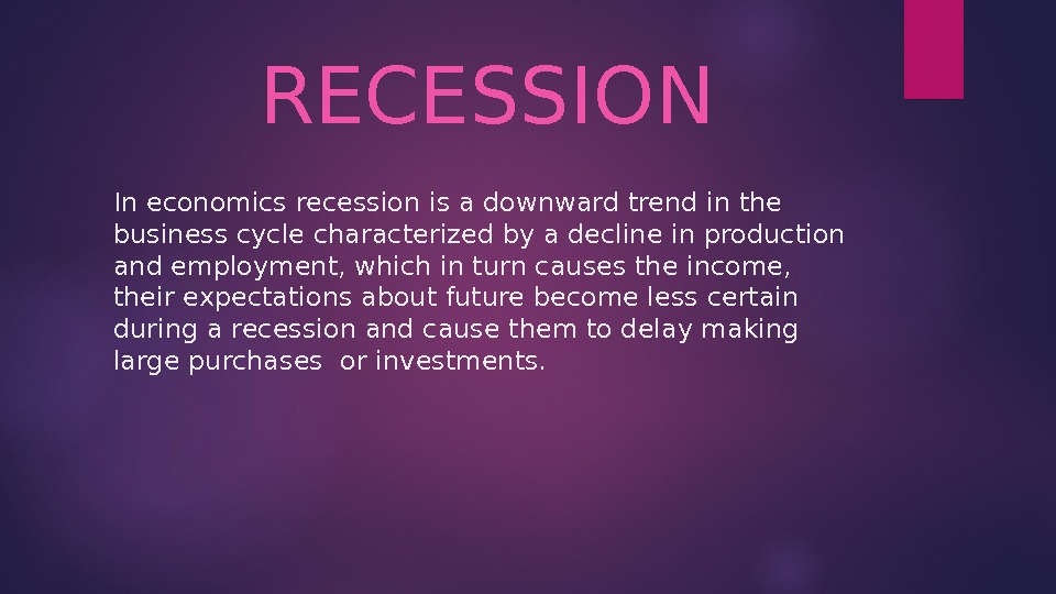 In economics recession is a downward trend in the business cycle characterized by a decline in production and employment, which in turn causes the income, their expectations about future become less certain during a recession and cause them to delay making large purchases or investments. RECESSION
