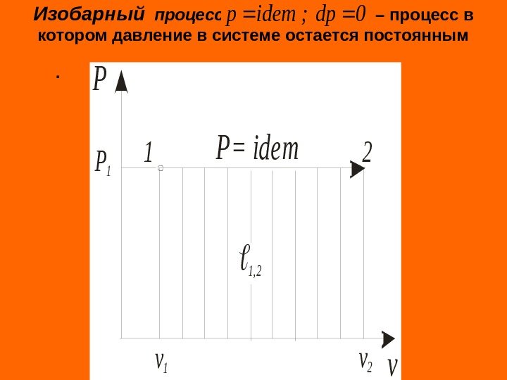 Изобарный процесс – процесс в котором давление в системе остается постоянным. 0 dp; idemp v 12 P P= ide m 1, 2 v 1 v 2 P