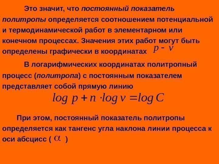 Это значит, что постоянный показатель политропы определяется соотношением потенциальной и термодинамической работ в элементарном или конечном процессах. Значения этих работ могут быть определены графически в координатах В логарифмических координатах политропный процесс ( политропа ) с постоянным показателем представляет собой прямую линию При этом, постоянный показатель политропы определяется как тангенс угла наклона линии процесса к оси абсцисс ( )vp Clogvlognplog